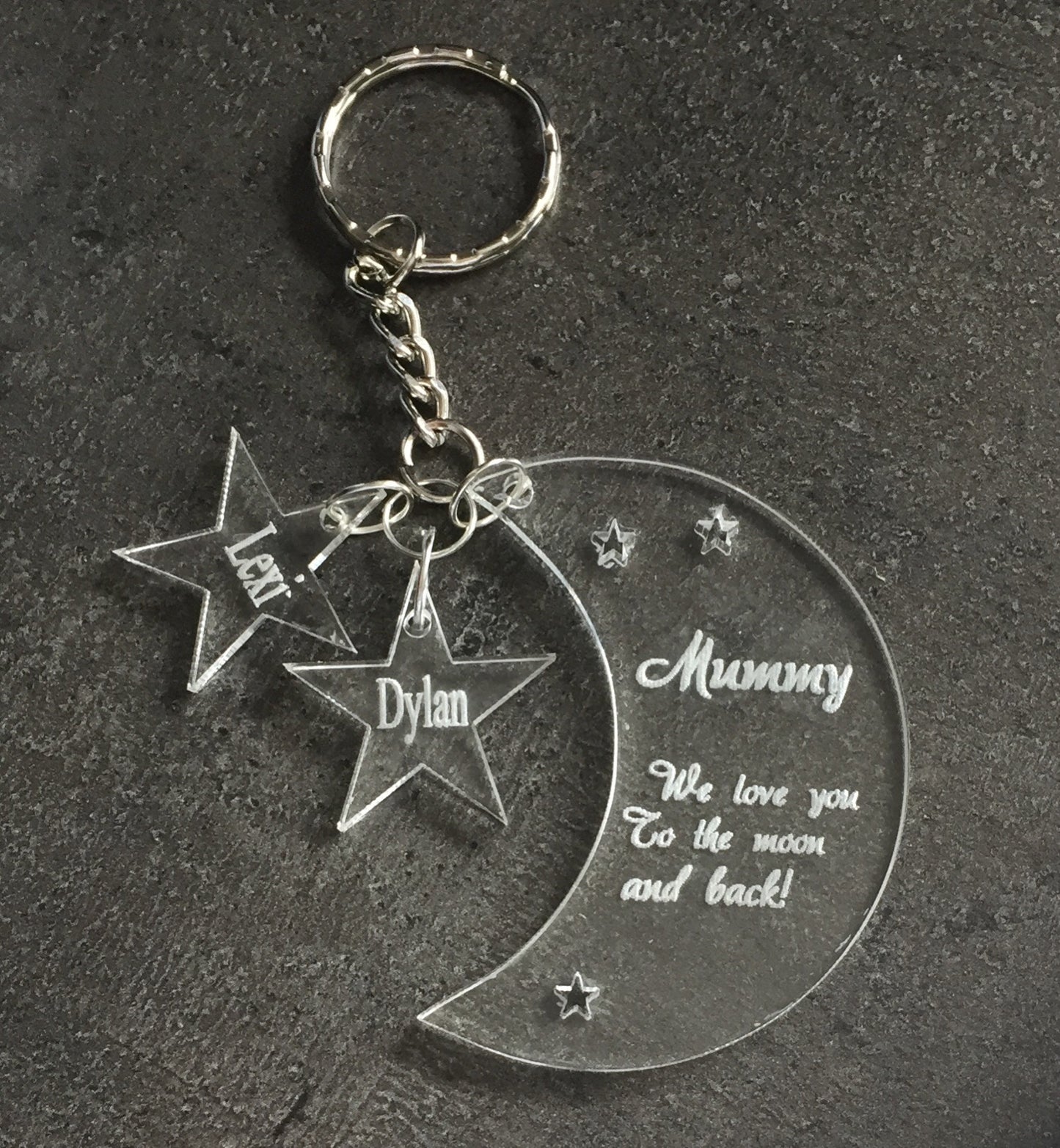 Made from 3mm Clear acrylic personalised keyring moon shape