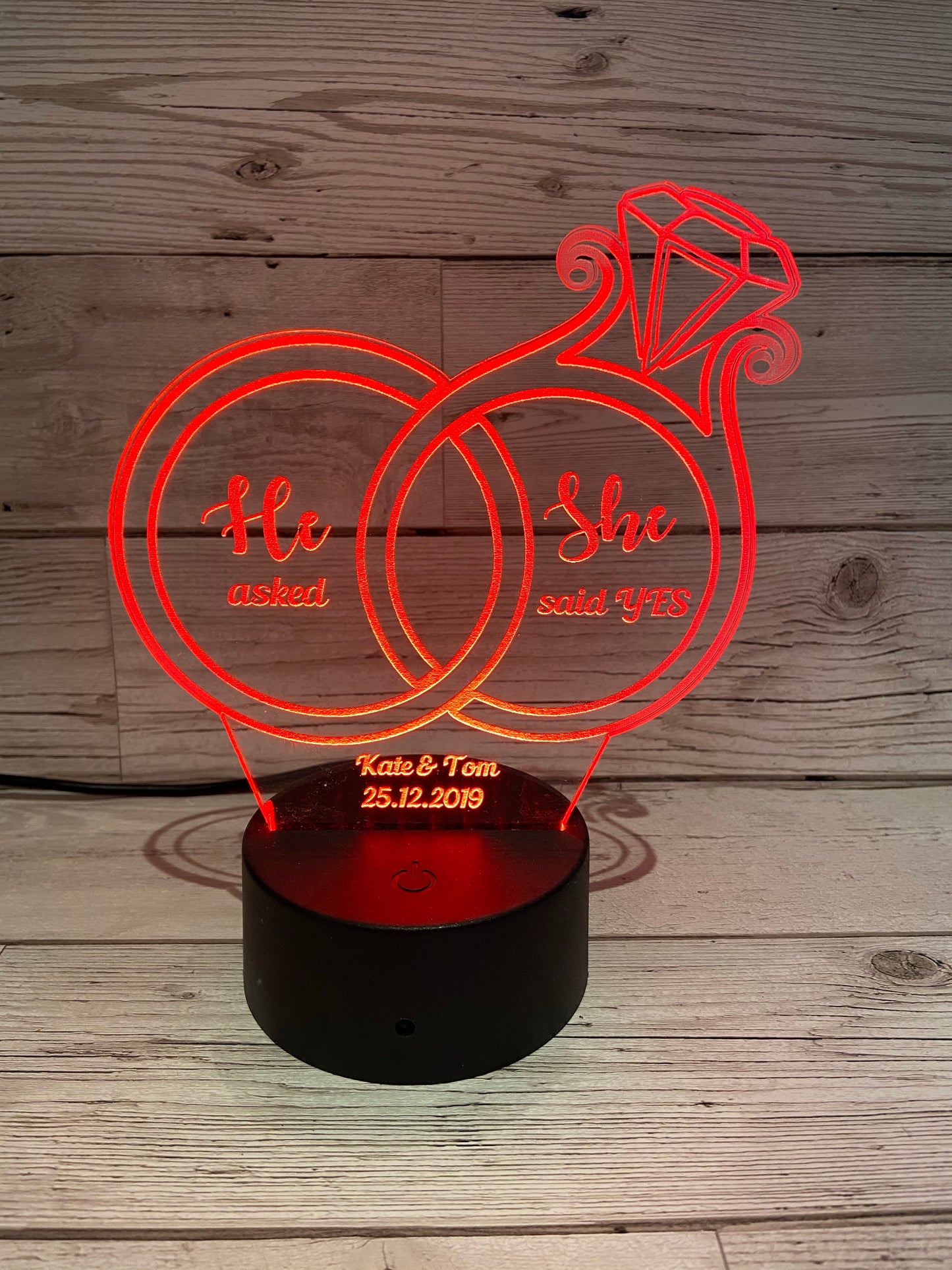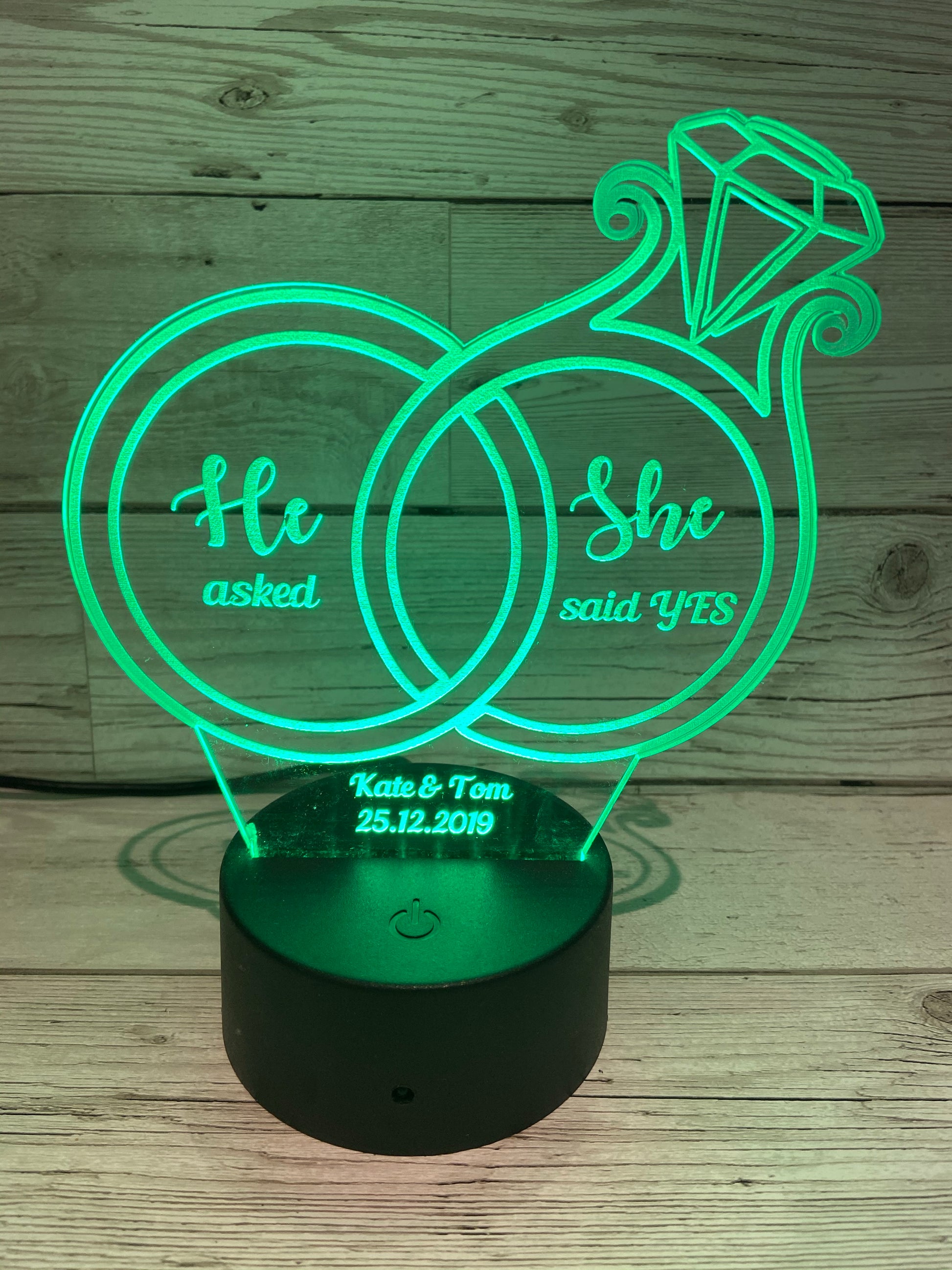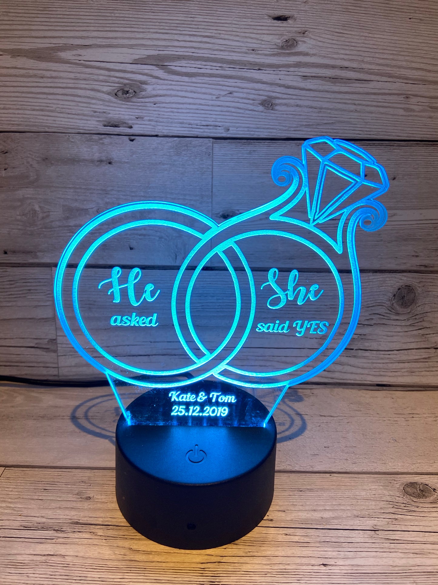Led light up 3D Ring engagement display. 9 Colour options with remote!
