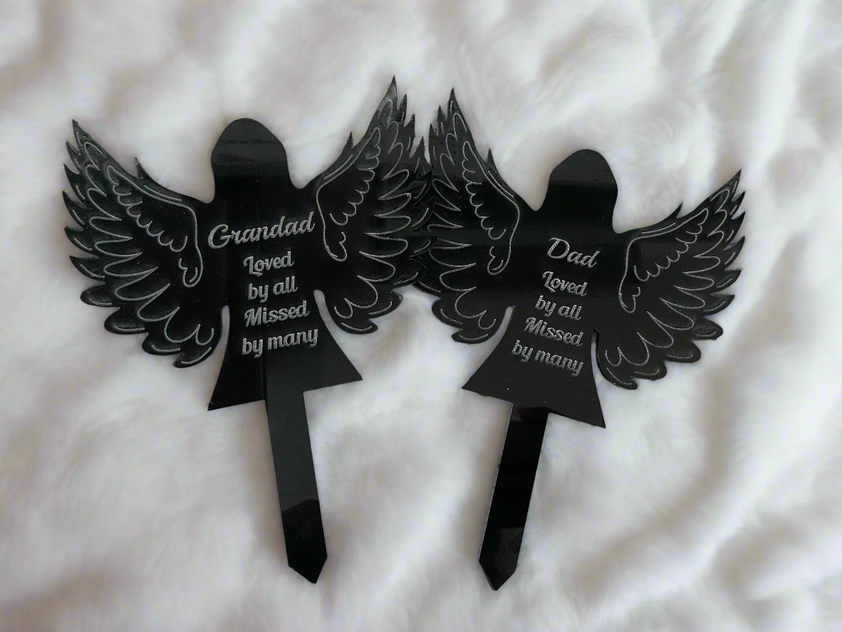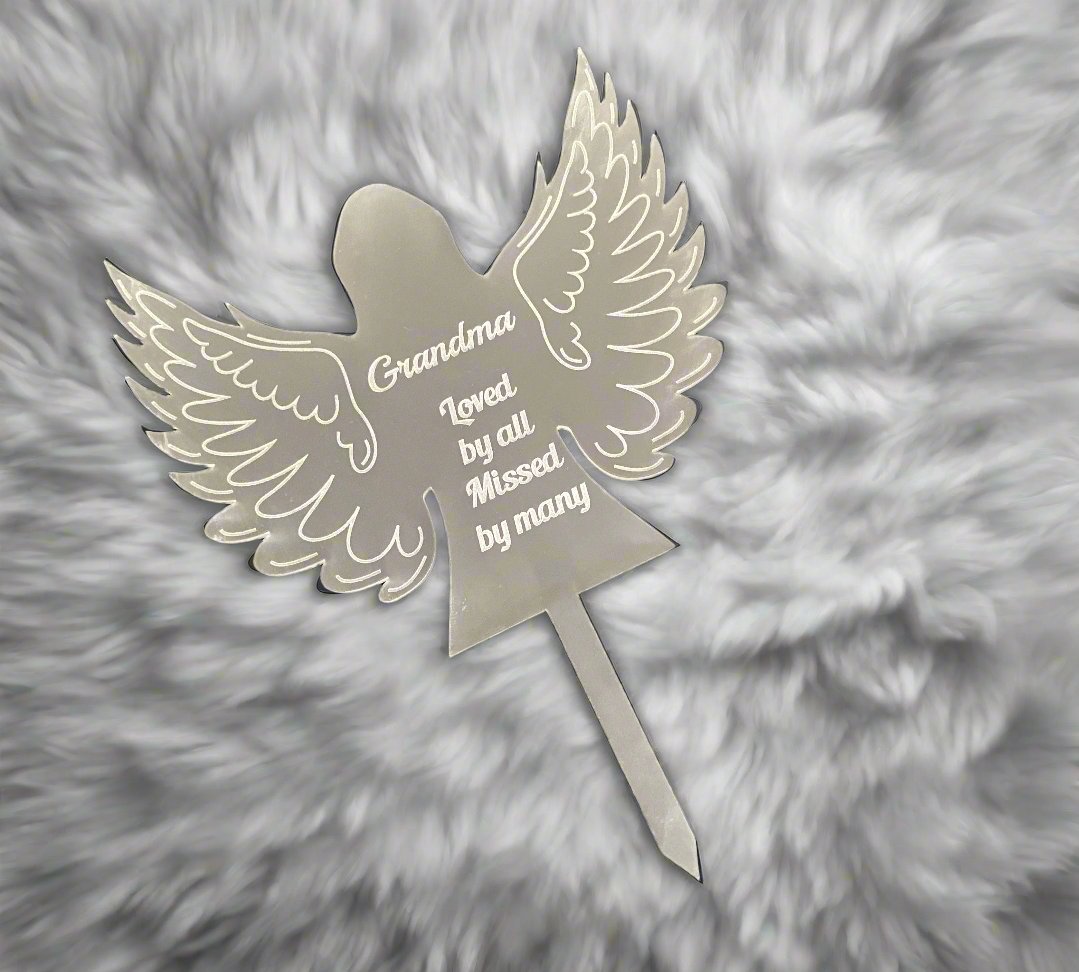 Made from 3mm acrylic grave marker , angel shape . Weatherproof