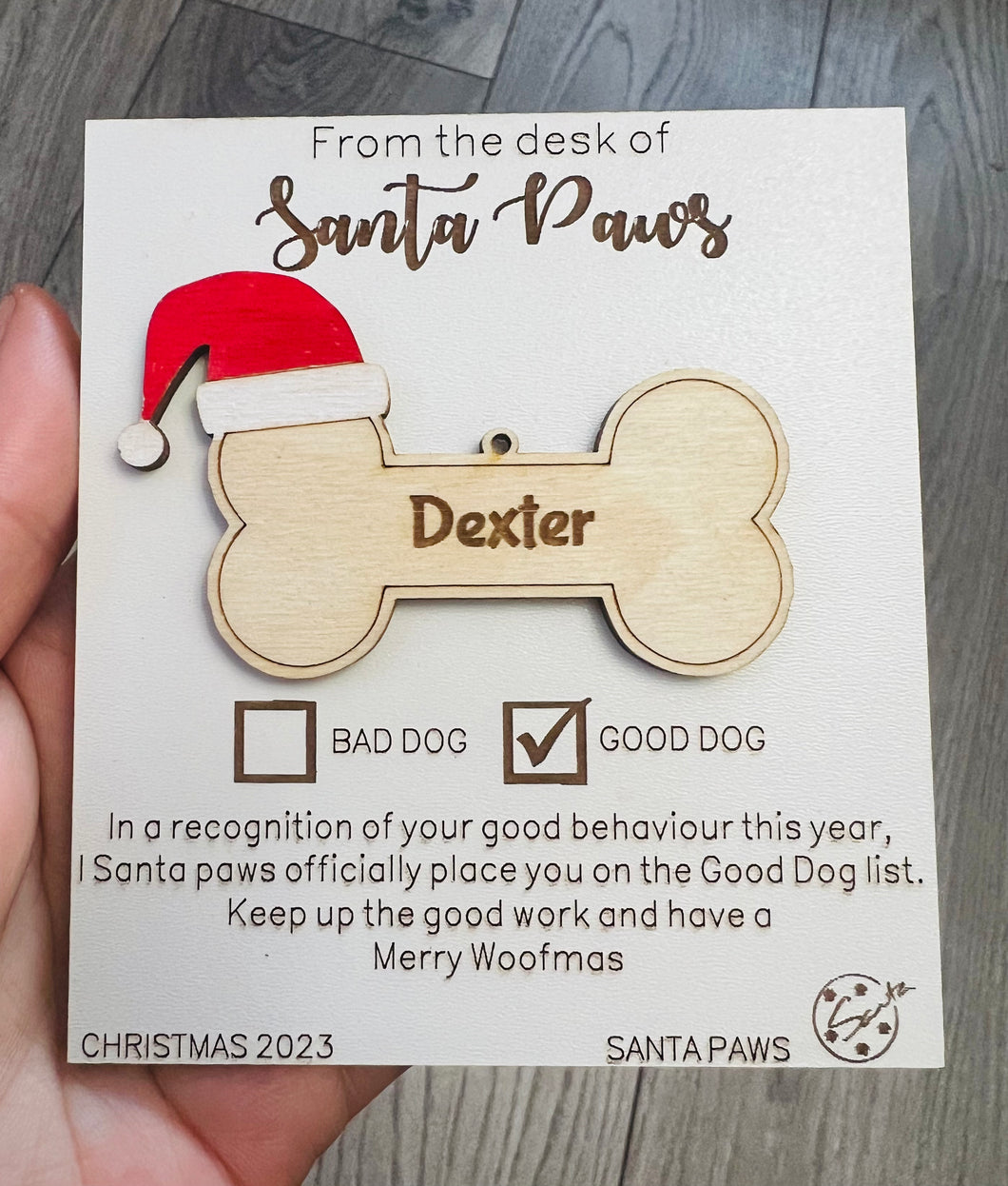 Wooden personalised Santa paws good dog card with dog bone decoration