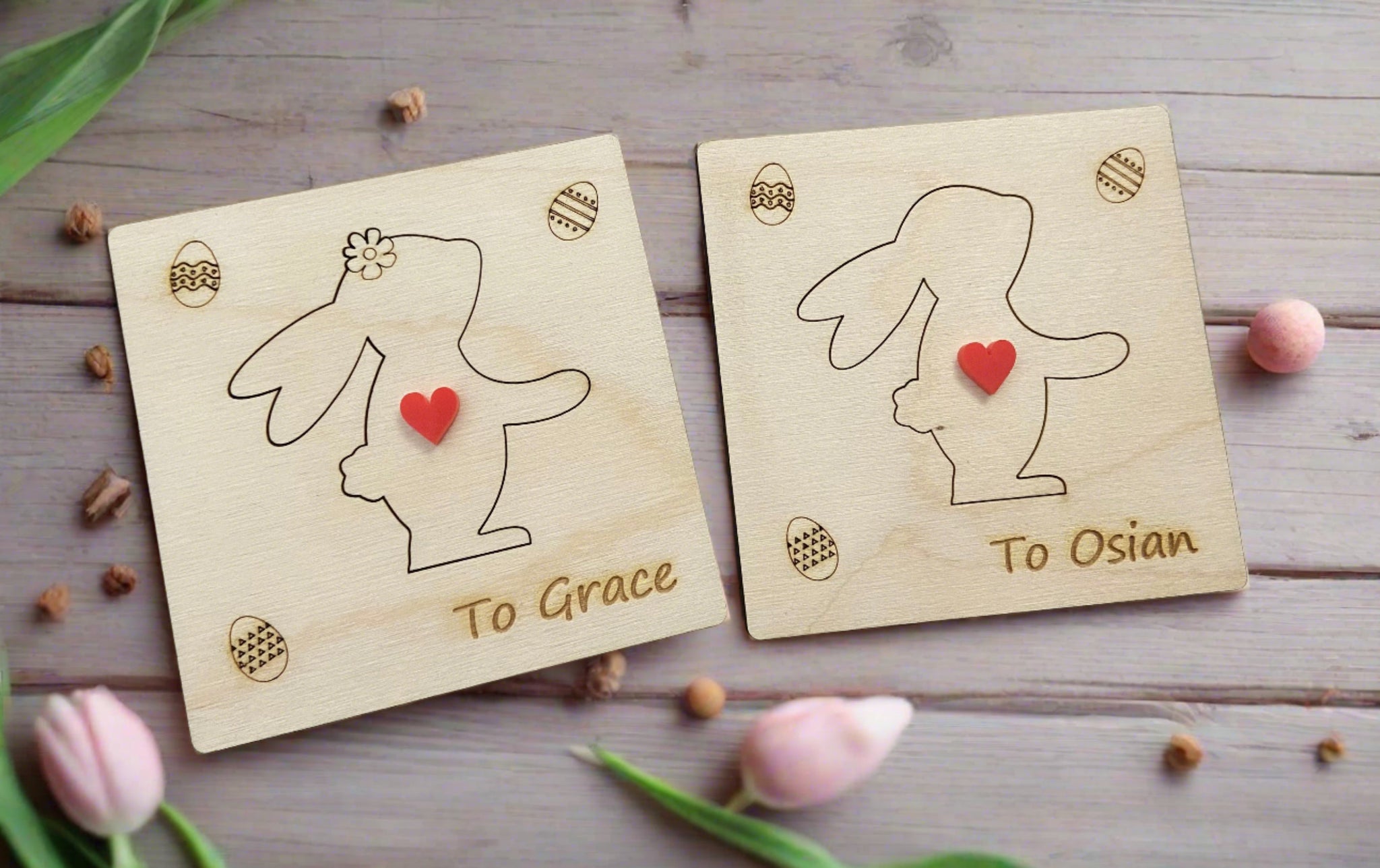 Made from 3mm birch wooden 3D bunny personalised card , reads “happy Easter ! Love The Easter bunny “