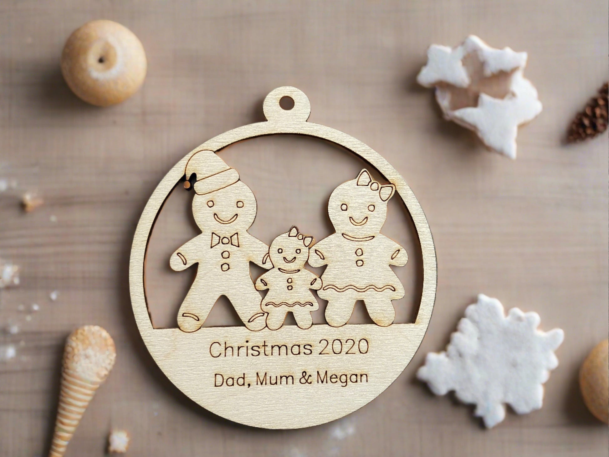 Wooden personalised gingerbread family bauble