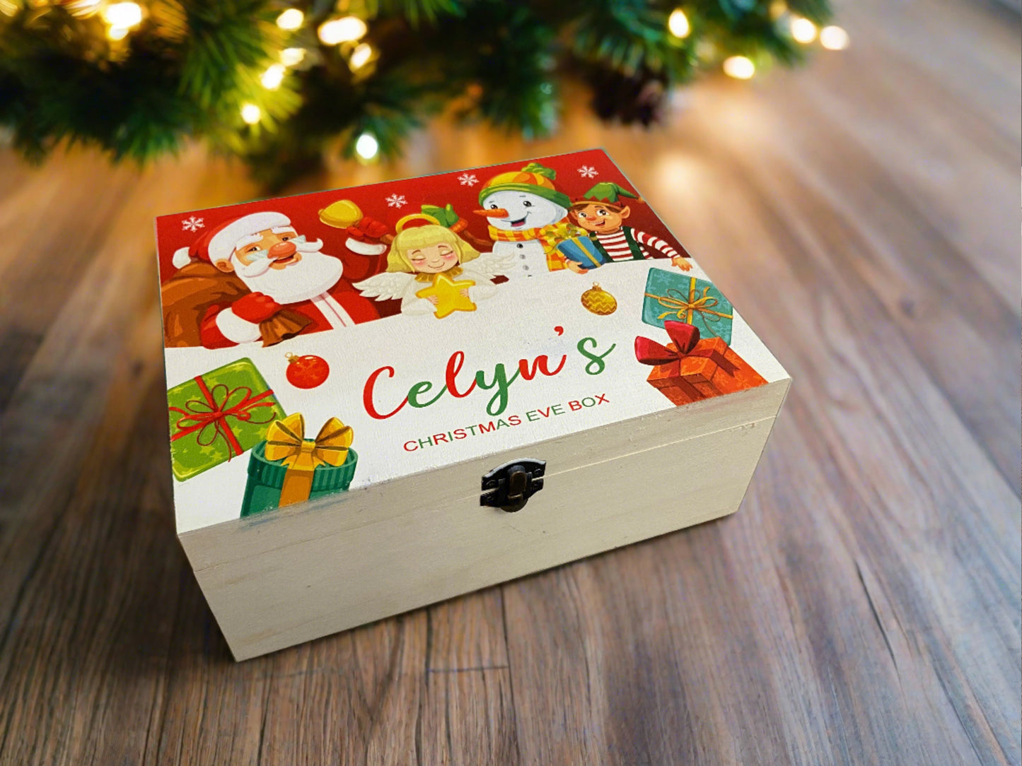 Wooden uv printed personalised Christmas Eve box , approx 25cmx 20cm x 10cm